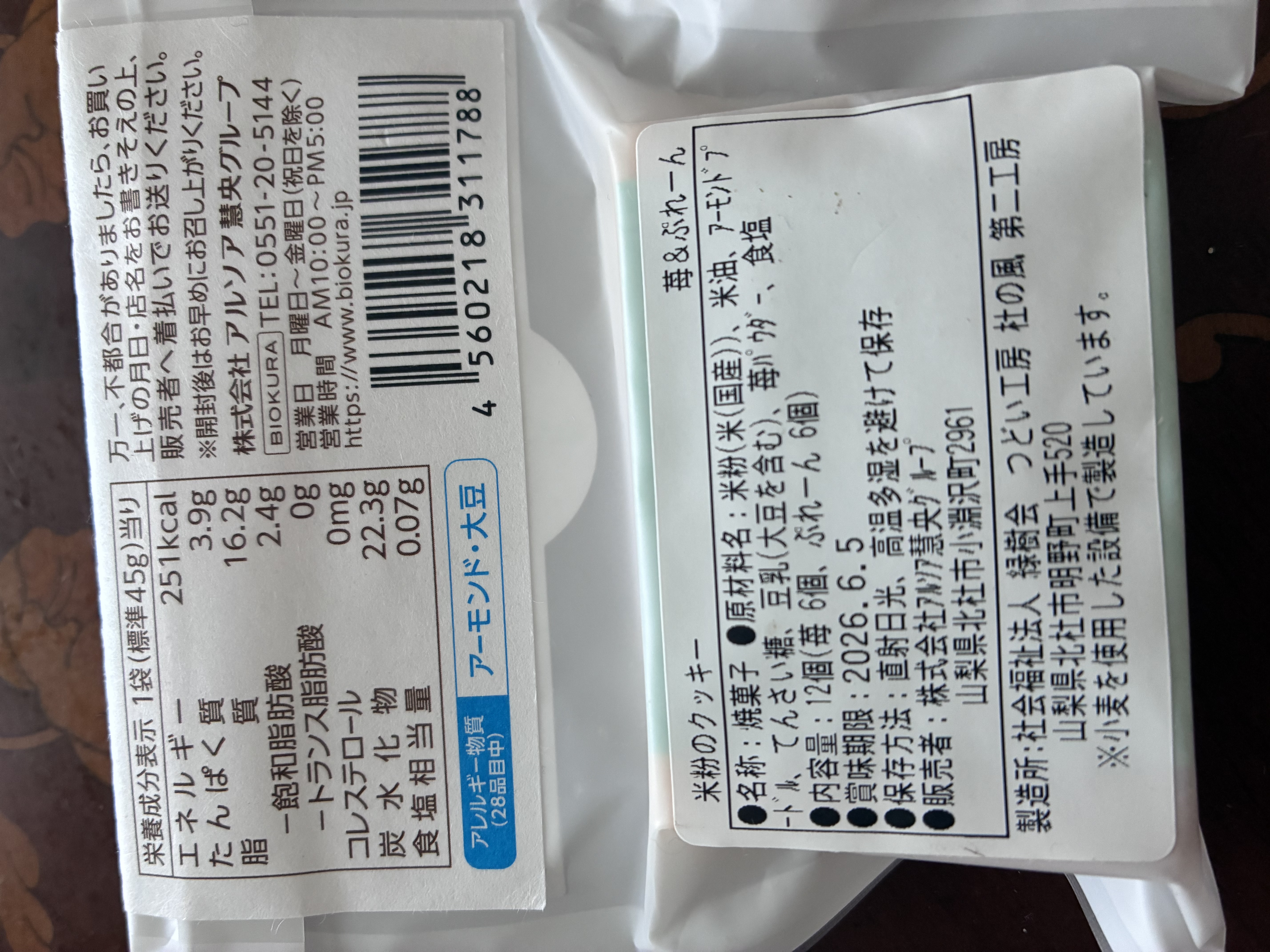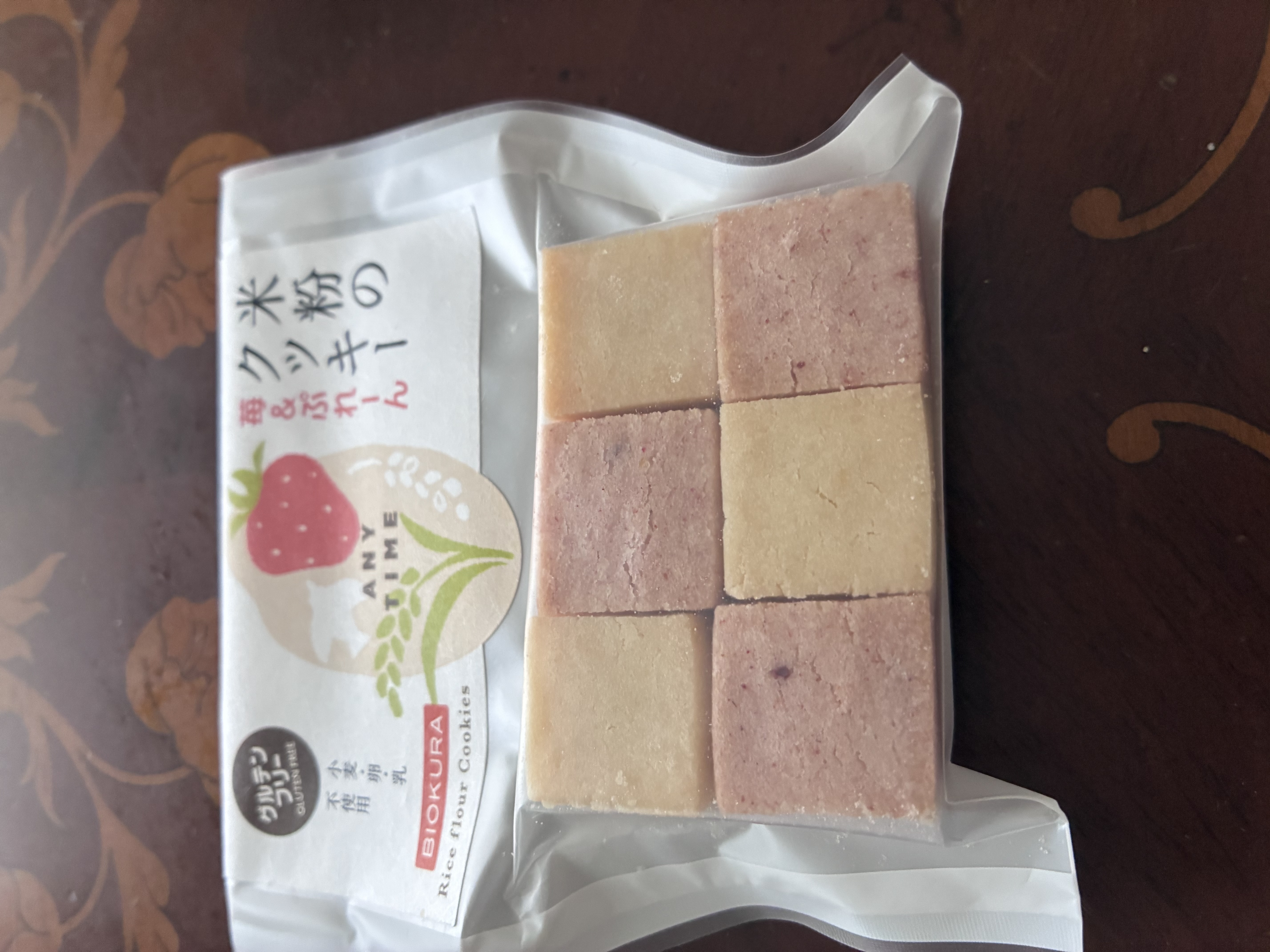 米粉クッキーのイチゴとプレーン味。 パッケージからも伝わる身体に優しく、程よい甘さとサクサクしっとりとした食感に感激です。 原材料にもこだわり罪悪感なくパクパクたべてしまう美味しさ!! いろんなお味のあるシリーズでまた食べたくなるステキな商品です。