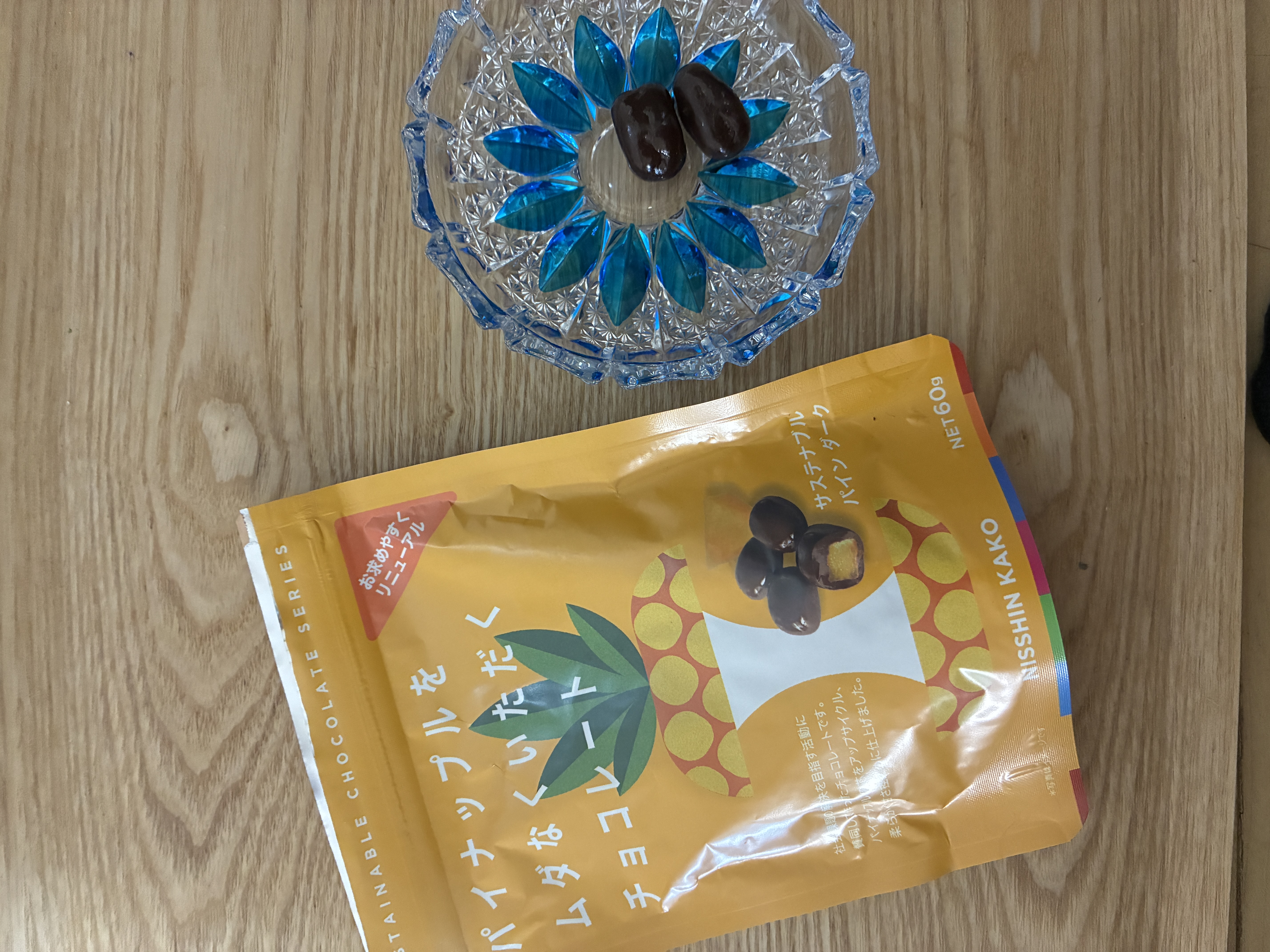 パイナップルをムダなくいただくチョコレートということで、通常は廃棄されるパイナップルの芯を使用してあるそうです 甘すぎず、酸味が強すぎずでチョコレートとマッサしていて美味しくいただけました パウチ型のパッケージも保管しやすくていいです