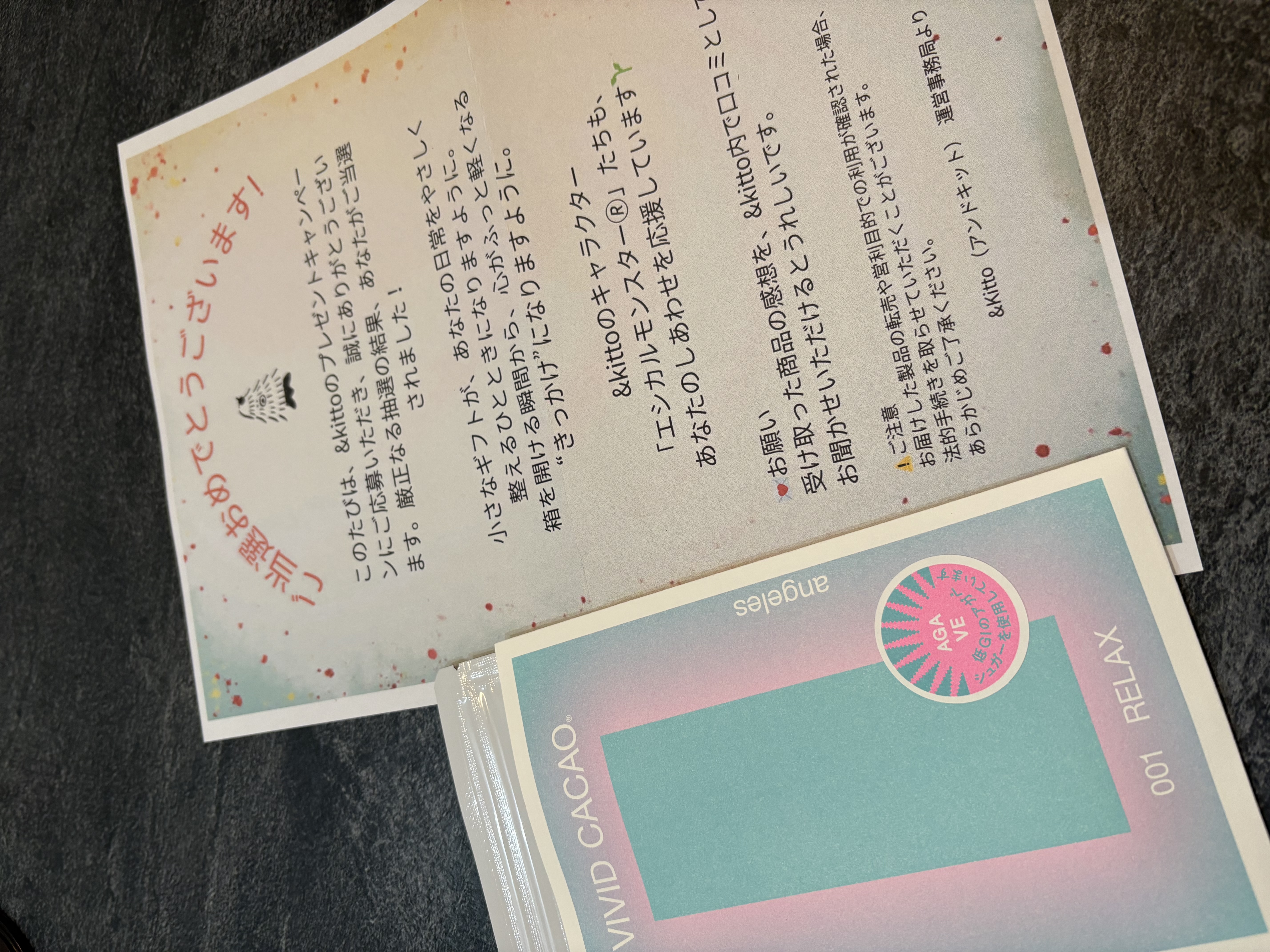 プレゼント企画に当選し、 チョコレートいただきました! 甘さ控えめで後味スッキリ食べやすく、 苦めなチョコが好きなので ちょうど良かったです! また機会があればリピートしたいです♪